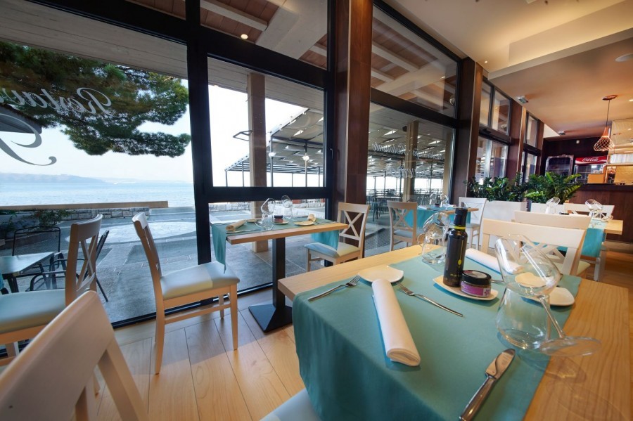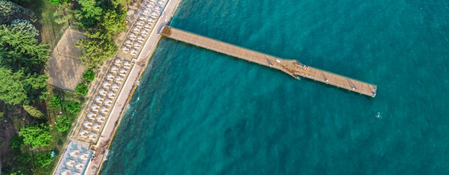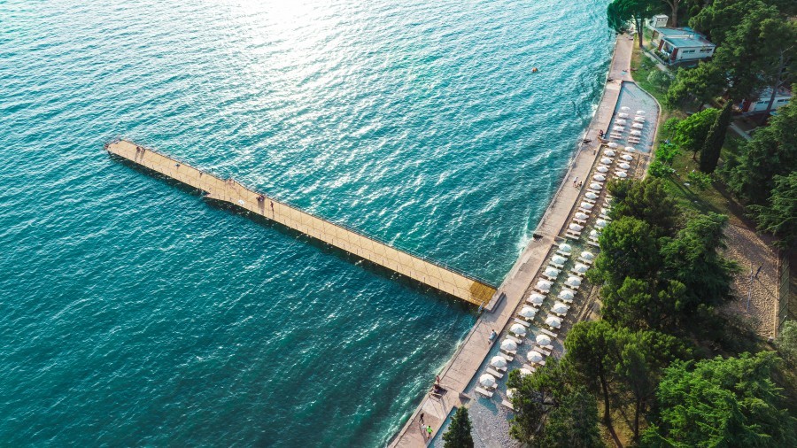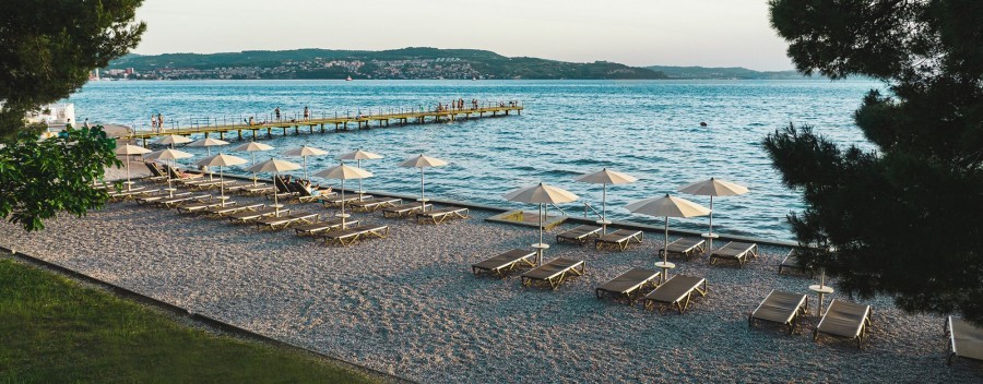 Pláž: Prostorná pláž s moly je betonová s mnoha travnatými plochami a mořské dno je oblázkové.