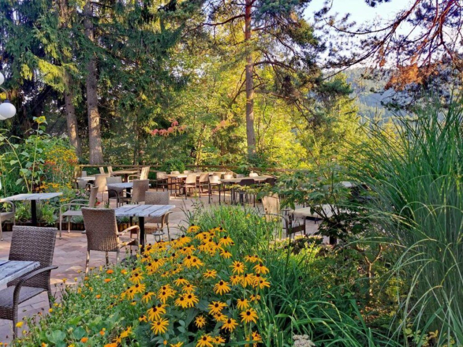 Příjemné posezení v restauraci s vyhlídkovou terasou a trávník vedle hotelu lákají k ochutnávce kulinářských pochoutek, příjemnému setkání při příležitosti rodinného oběda, výročí, pikniku, nebo dokonce svatební hostiny.
