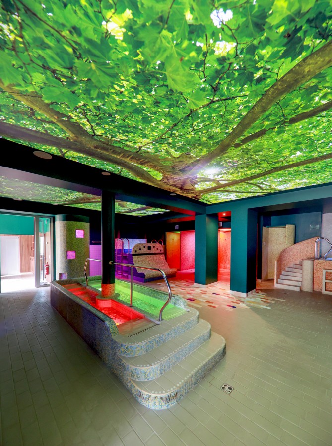 VYBAVENÍ: dva kryté termální bazény, wellness centrum Vitaleum – termální bazén, teplota 30 – 33°C, whirlpool, dětský bazén, terasa na opalování, finská a turecká sauna, solárium, ruční thajské masáže, masáže shiatsu, aromaterapie, perličkové koupele. Dětský koutek s bazénem.