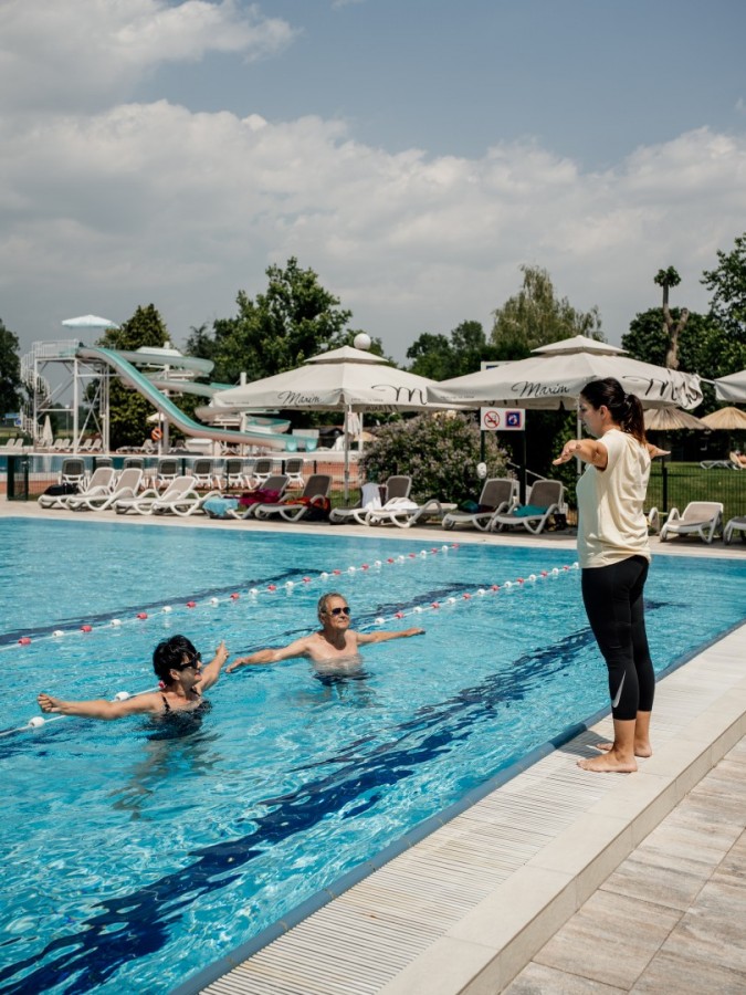 V areálu vodního parku se nachází tři venkovní bazény a jeden vnitřní bazén s termální vodou (34-38 °C), plavecký bazén s vodou regulované teploty, bazén se skluzavkou a dětský bazén. Bazénový komplex je zaměřen na hosty všech generací. Z důvodu uspokojení přání i těch nejmladších hostů se v areálu vodního parku uskutečňují různé zábavné programy.